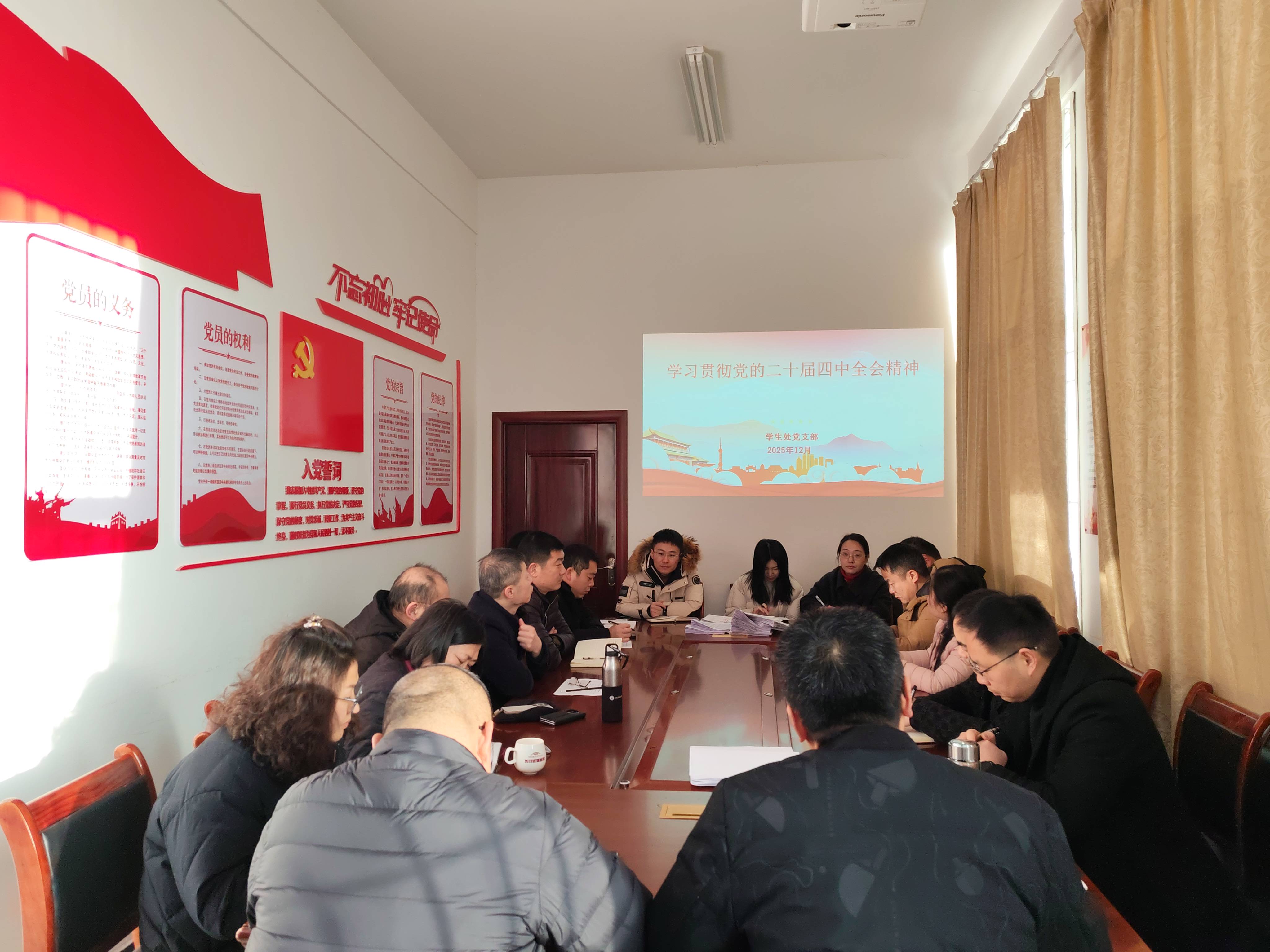 为深入学习贯彻党的二十届四中全会精神,切实把全体党员的思想和行动统一到党中央决策部署上来,12月29日,学生处党支部以“学习贯彻党的二十届四中全会精神”为主题开展党日活动,通过“领学+视频观看+研讨”的形式,推动全会精神入脑入心、落地生根。活动由党支部书记代翔主持。